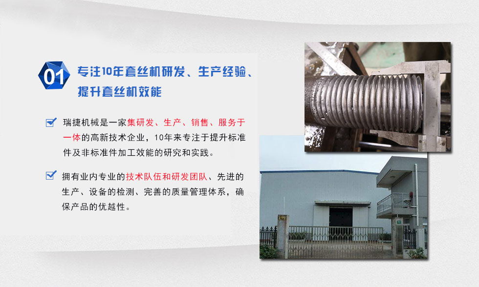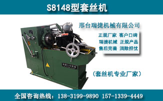 河北省邢臺(tái)市瑞捷機(jī)械設(shè)備公司,創(chuàng)建于2003年,坐落在全國(guó)的機(jī)械制之鄉(xiāng)-邢家灣工業(yè)區(qū)。本廠(chǎng)專(zhuān)業(yè)制造套絲機(jī),TS80型套絲機(jī),TS64型套絲機(jī),TS50型套絲機(jī),螺栓套絲機(jī),S8139型套絲機(jī),S8148型套絲機(jī)圓鋼/圓管套絲機(jī)及切線(xiàn)板牙頭等配套產(chǎn)品。