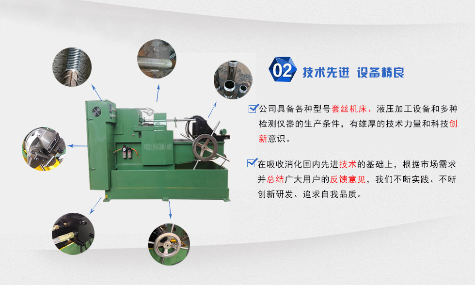 圓鋼套絲機(jī)也是管螺紋套絲機(jī)的一種,是一款多功能套絲機(jī),被加工工件加在對(duì)口鉗上,隨手扳動(dòng)手輪螺紋就會(huì)自動(dòng)拉住工件進(jìn)行切削螺紋,切削螺紋長(zhǎng)度有床身中裝帶擋鐵的聯(lián)桿來(lái)控制切削螺紋的長(zhǎng)度,螺紋切頭由聯(lián)桿轉(zhuǎn)動(dòng)便會(huì)自動(dòng)脫開(kāi),主軸由各級(jí)轉(zhuǎn)速調(diào)整方便。本公司立足于先進(jìn)的技術(shù)能力和全新的經(jīng)營(yíng)理念,擁有行業(yè)優(yōu)秀的專(zhuān)家,公司研發(fā)隊(duì)伍和營(yíng)銷(xiāo)團(tuán)隊(duì)均由試驗(yàn)機(jī)行業(yè)和機(jī)床行業(yè)的精英組成,具備承接各類(lèi)通用設(shè)備、專(zhuān)用設(shè)備的設(shè)計(jì)、生產(chǎn)、服務(wù)能力,并以解決用戶(hù)在試驗(yàn)過(guò)程中遇到的各種問(wèn)題為突出特點(diǎn),瑞捷套絲機(jī)生產(chǎn)公司是一家專(zhuān)業(yè)解決套絲問(wèn)題的專(zhuān)家。我公司不但擁有現(xiàn)代化的生產(chǎn)設(shè)備、優(yōu)秀的技術(shù)人才,并隨時(shí)注入與新技術(shù)進(jìn)行新產(chǎn)品的開(kāi)發(fā)和應(yīng)用,保證技術(shù)和產(chǎn)品的先進(jìn)性,以滿(mǎn)足用戶(hù)需求為己任,為用戶(hù)提供從設(shè)計(jì)、生產(chǎn)到培訓(xùn)等人性化的全面服務(wù),提供真正適合用戶(hù)需要的先進(jìn)的個(gè)性化產(chǎn)品。