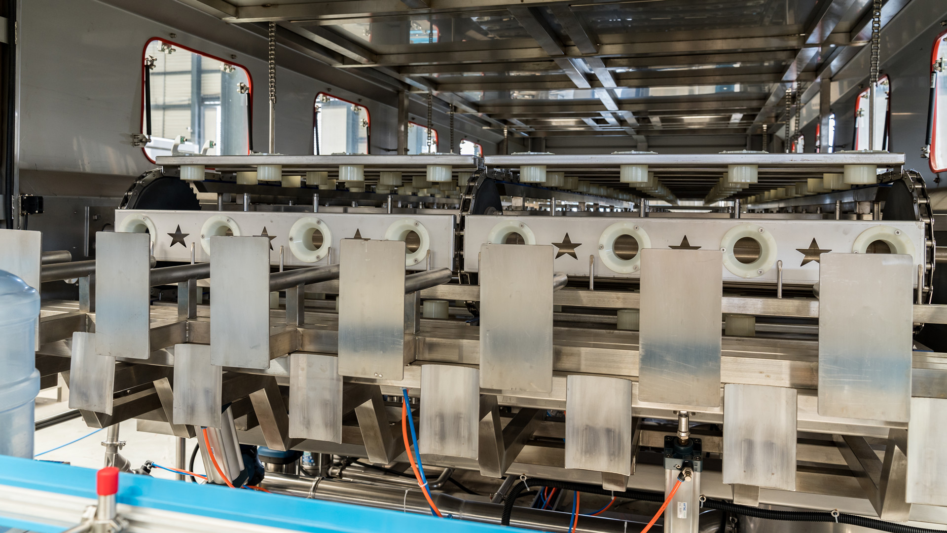 工作步驟:自動拔蓋-自動外刷桶-自動上桶-藥洗-原水內(nèi)外洗-純水內(nèi)洗-灌裝-自動理蓋-壓蓋-自動傳送帶傳出-燈檢-熱縮-成品